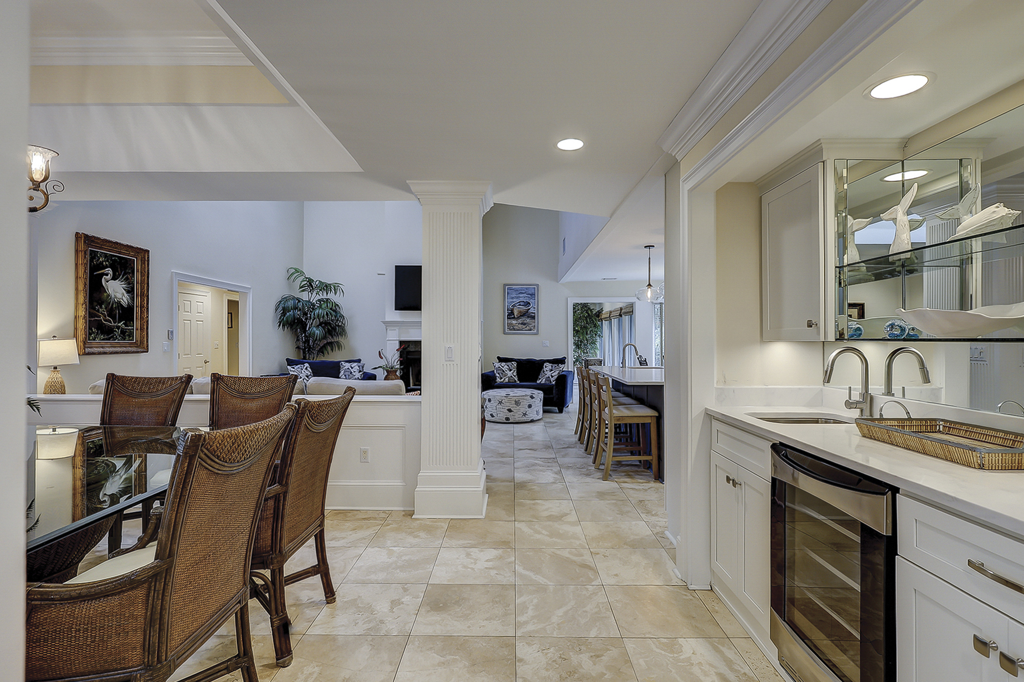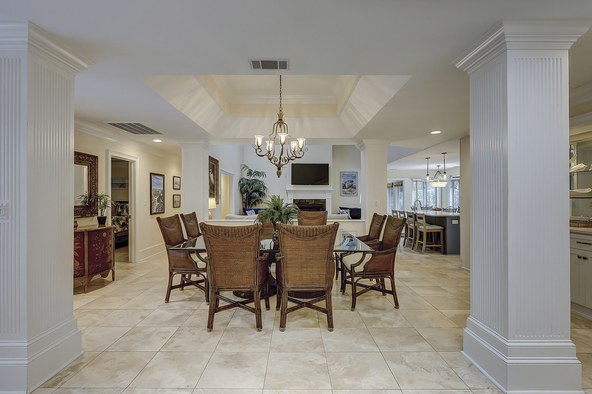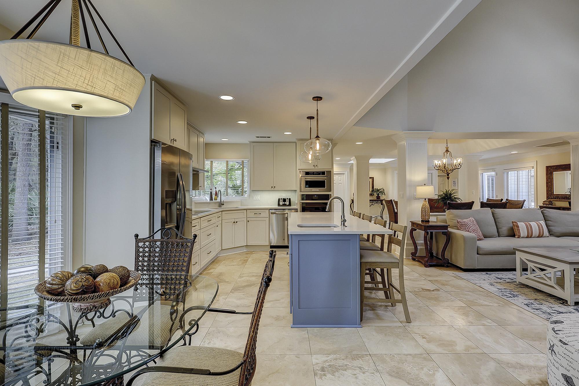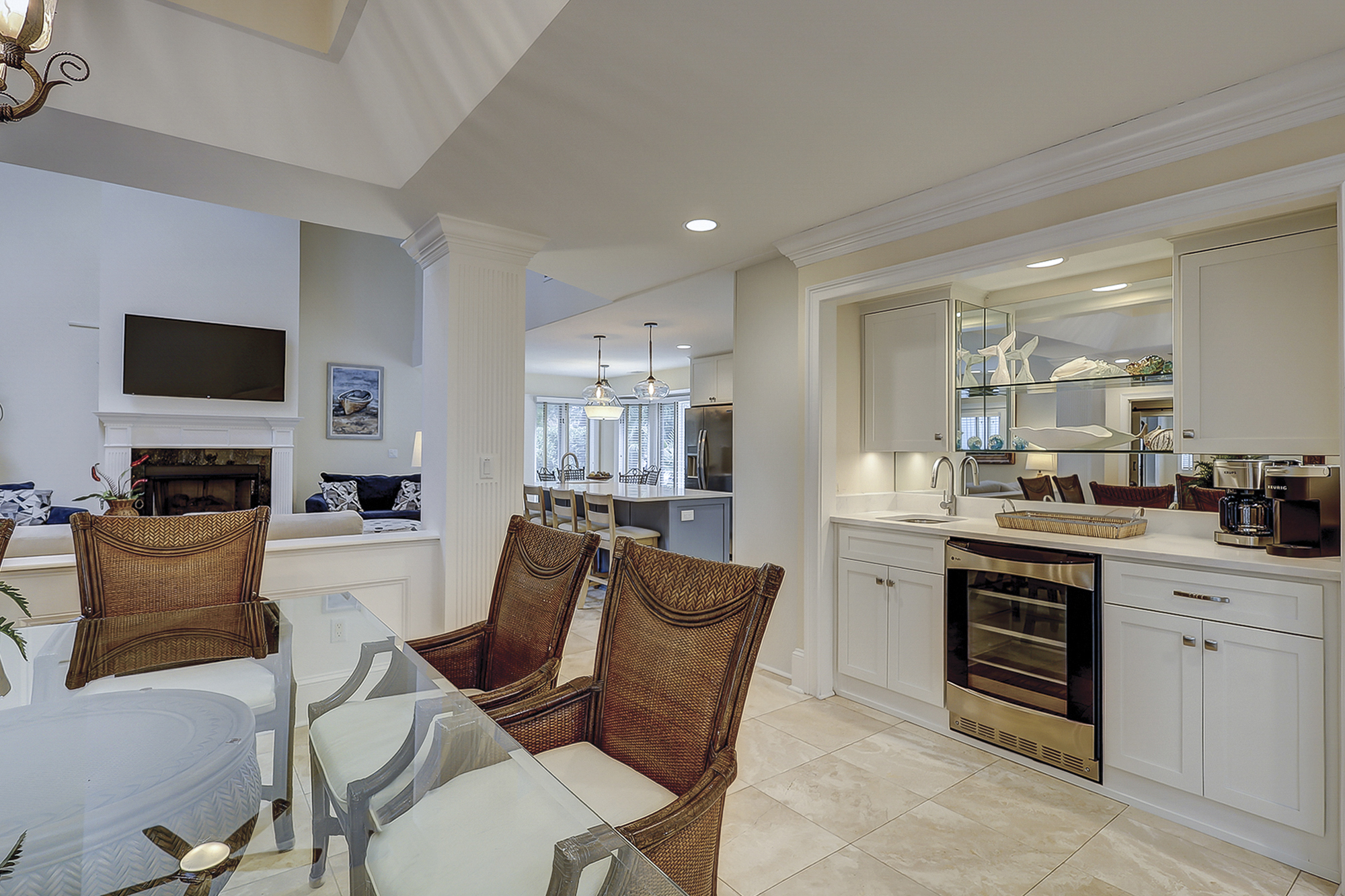 The dining room table can seat up to eight. There is a breakfast table with seating for four plus additional bar top seating in the kitchen. The kitchen, living area and dining areas are all open. The living room has plenty of seating and a 65” flat screen TV. The kitchen has a large island, granite countertops and stainless steel appliances. Steps away is a wet bar with a wine/beverage cooler.