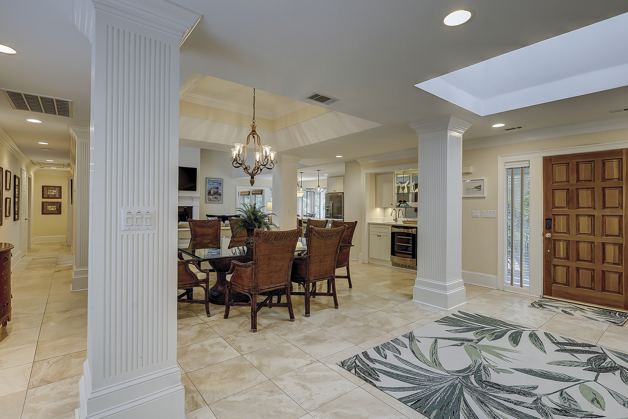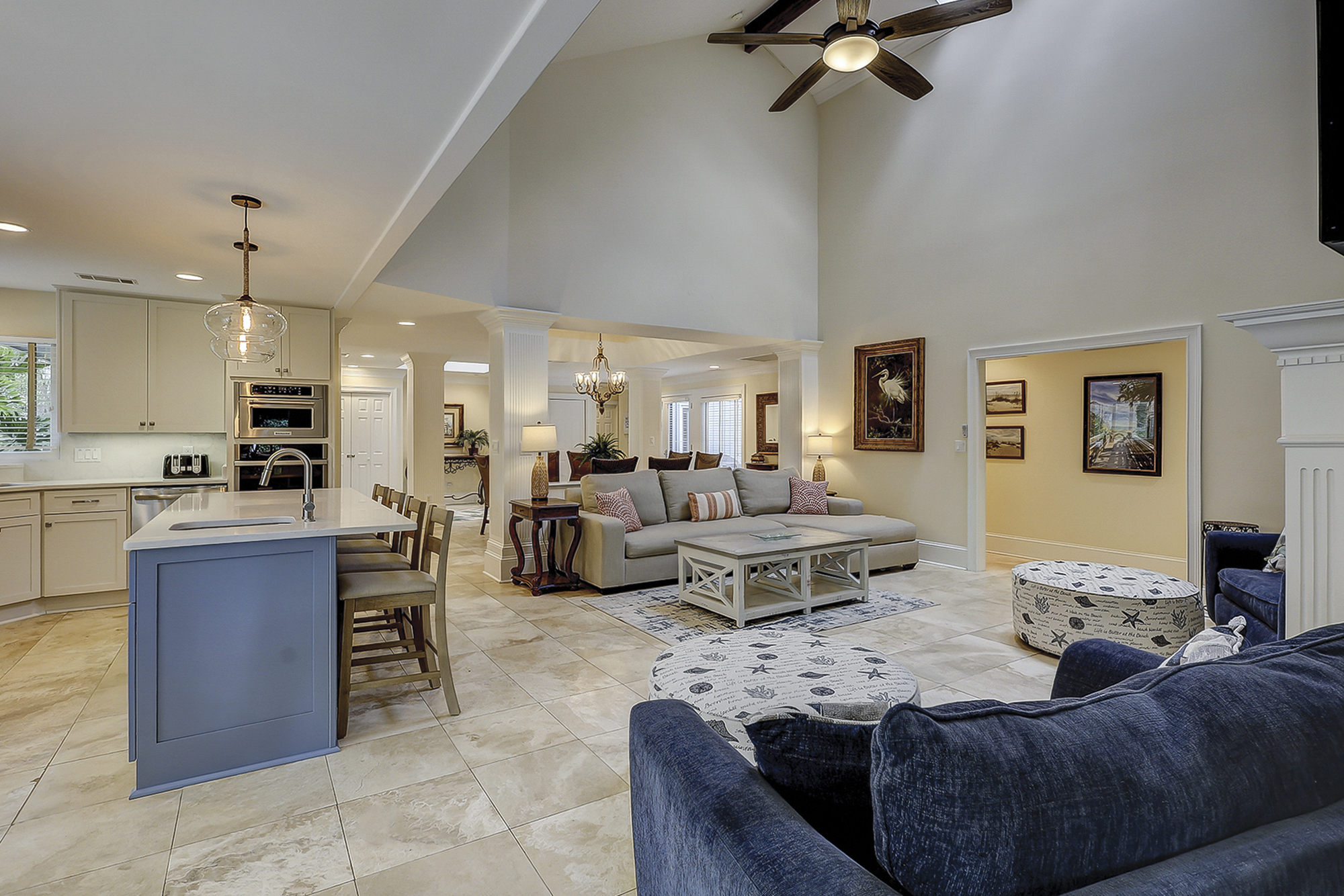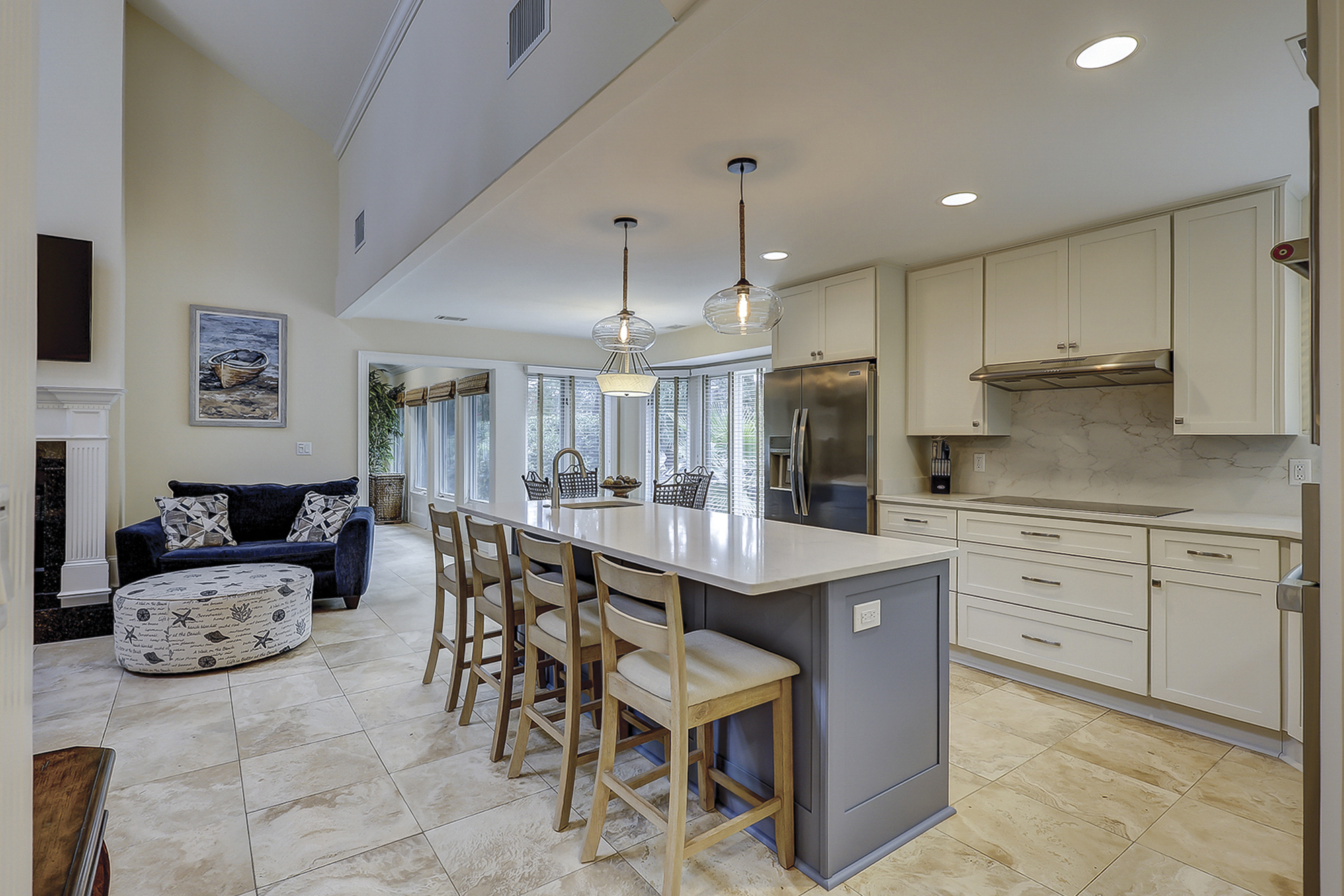 The dining room table can seat up to eight. There is a breakfast table with seating for four plus additional bar top seating in the kitchen. The kitchen, living area and dining areas are all open. The living room has plenty of seating and a 65” flat screen TV. The kitchen has a large island, granite countertops and stainless steel appliances. Steps away is a wet bar with a wine/beverage cooler.