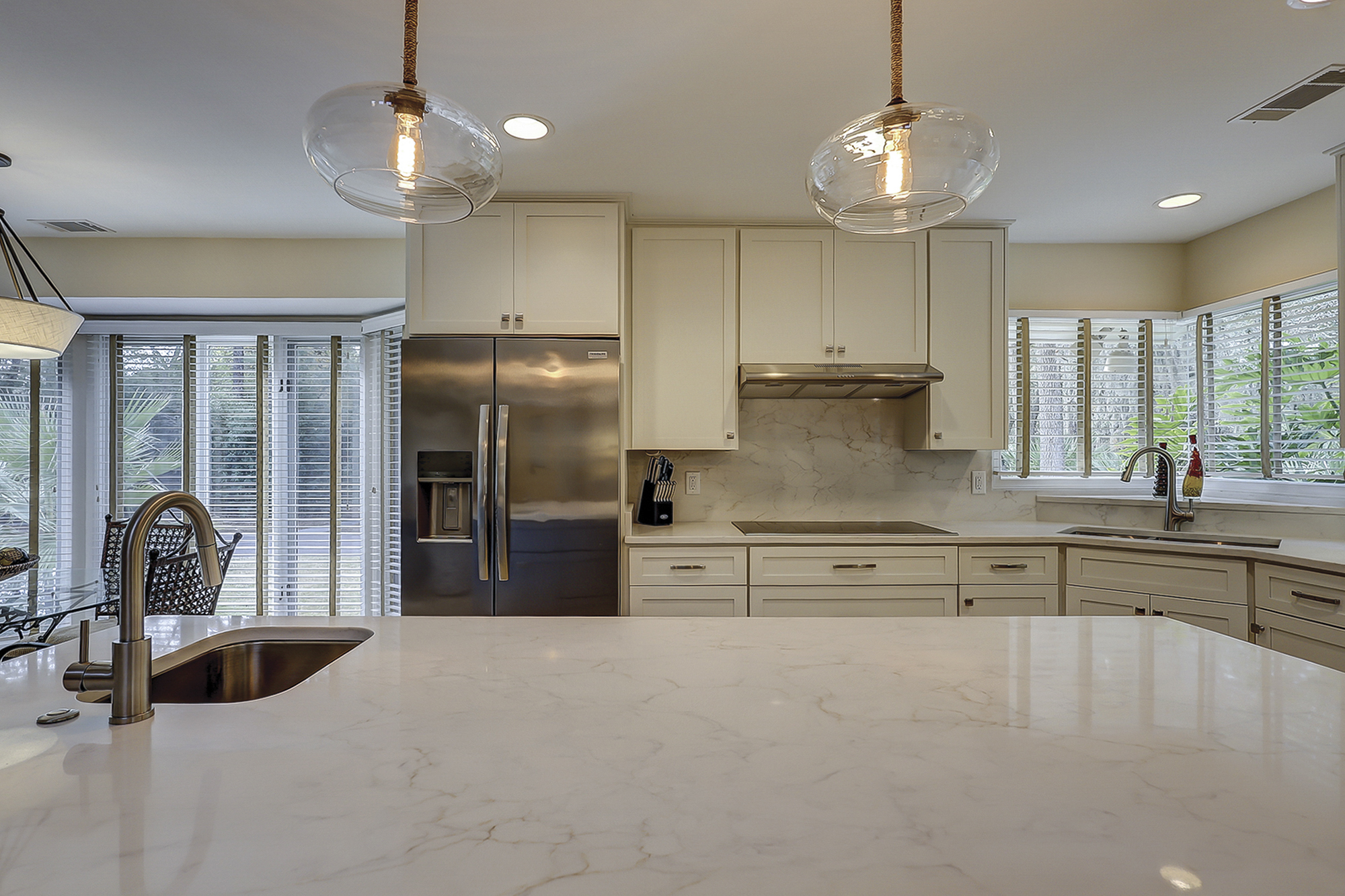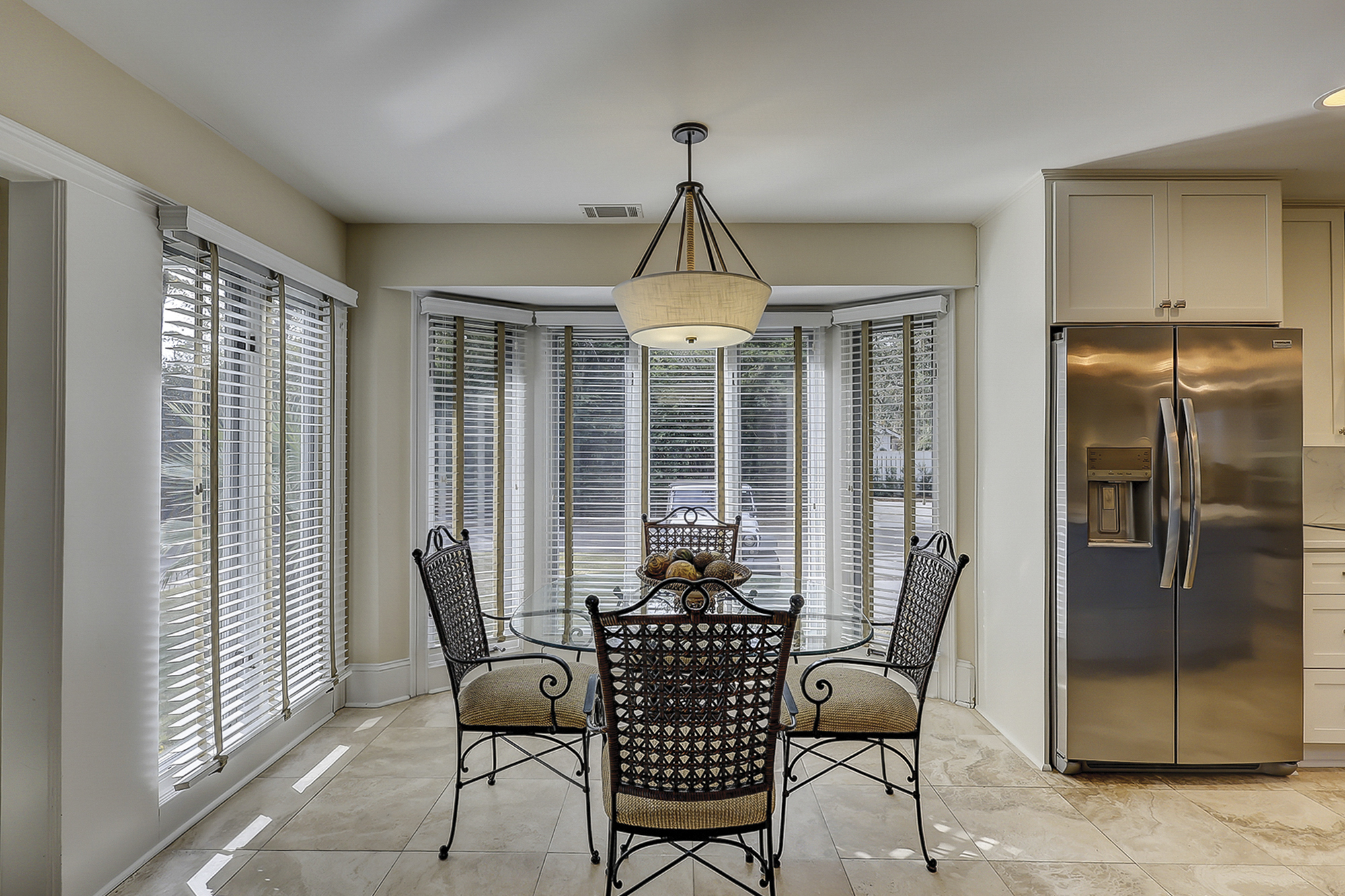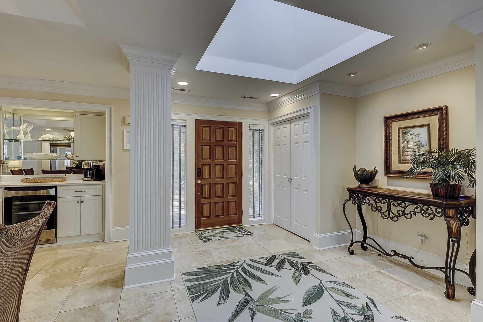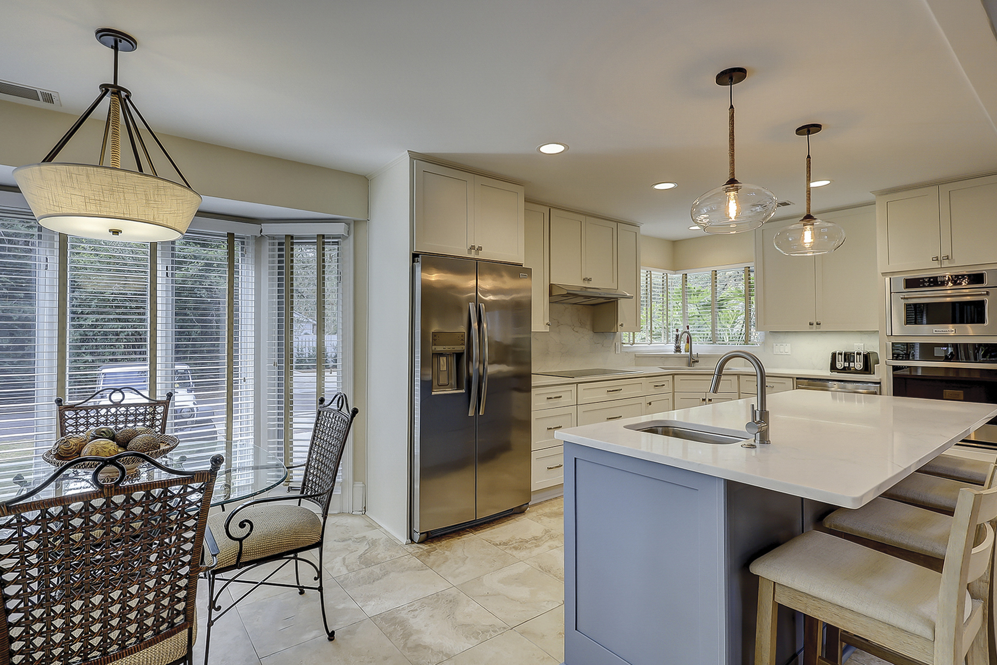 The dining room table can seat up to eight. There is a breakfast table with seating for four plus additional bar top seating in the kitchen. The kitchen, living area and dining areas are all open. The living room has plenty of seating and a 65” flat screen TV. The kitchen has a large island, granite countertops and stainless steel appliances. Steps away is a wet bar with a wine/beverage cooler.
