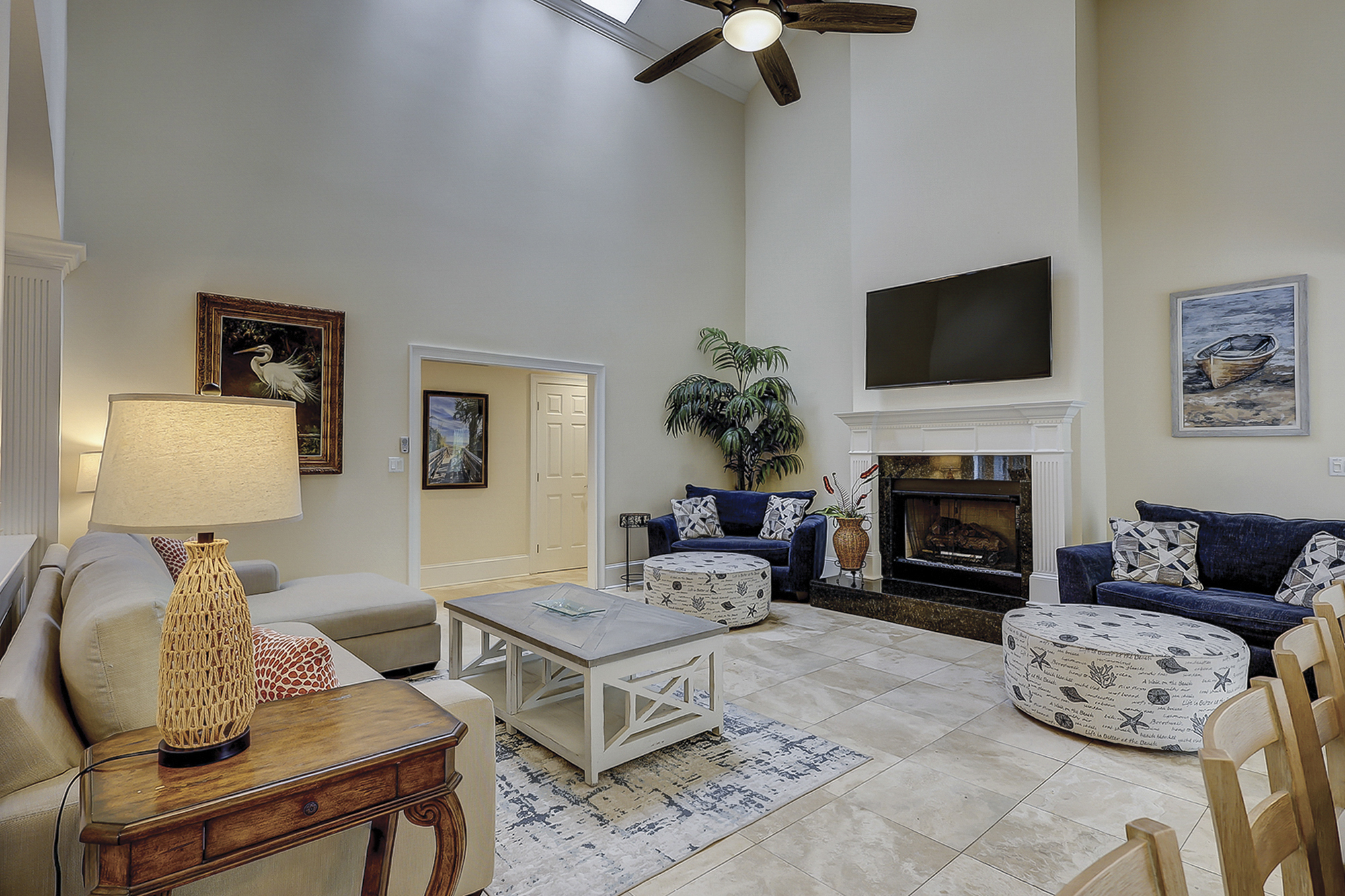 The second living area has a large sectional sofa and an 82” flat screen TV with access to the pool deck. There is a powder room and washer/dryer located off the main living area.