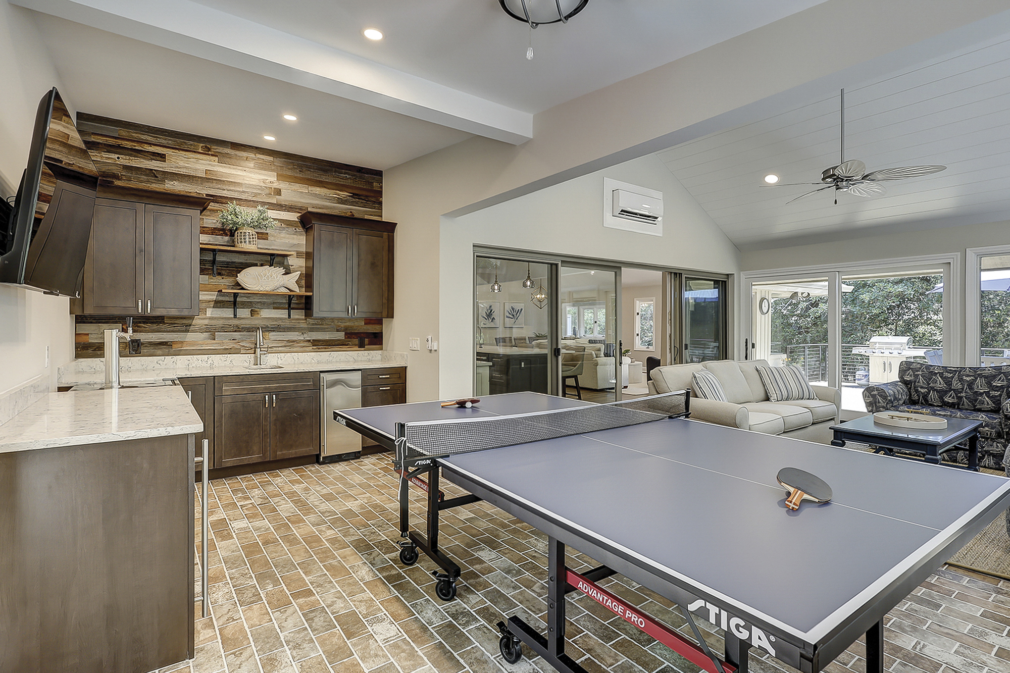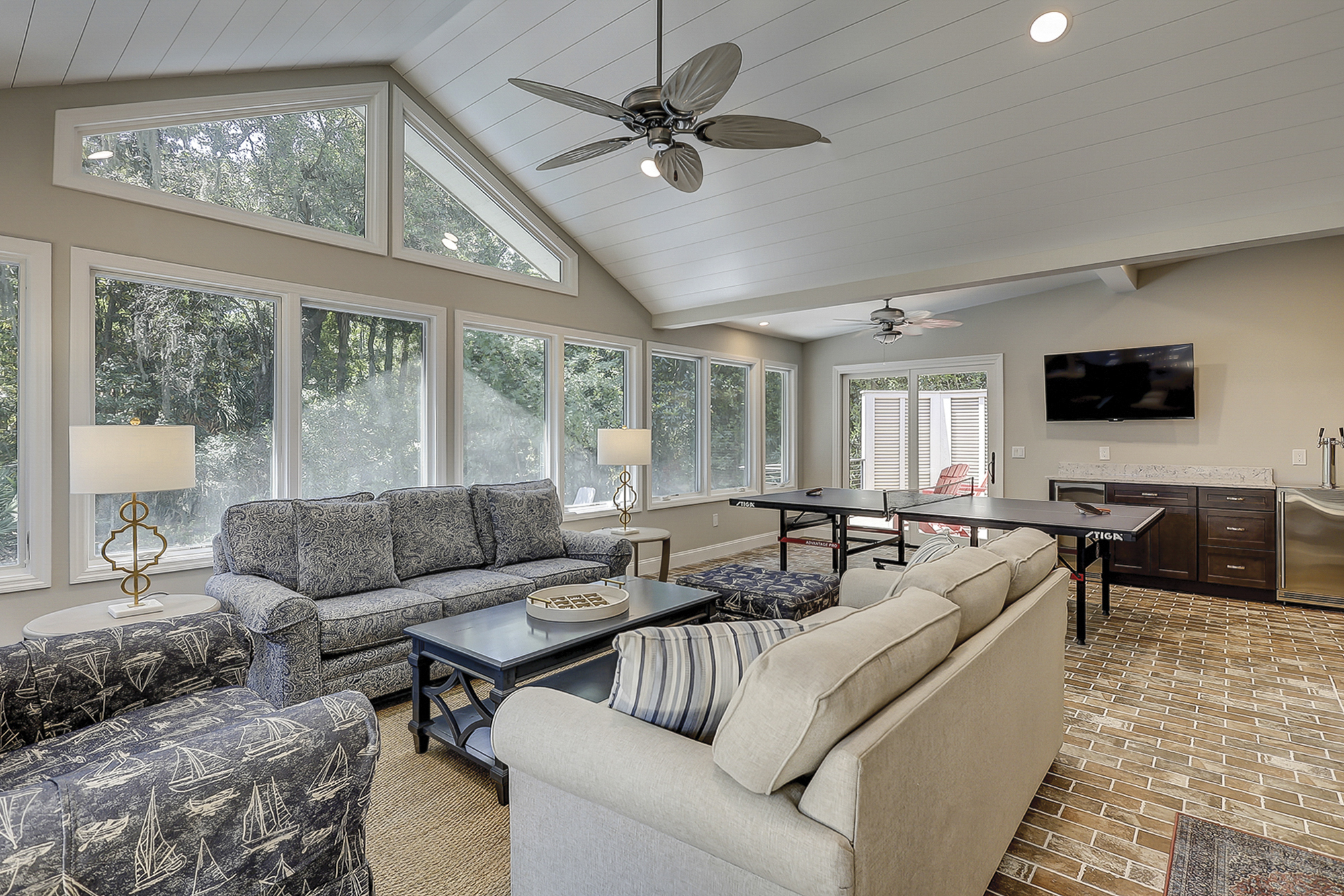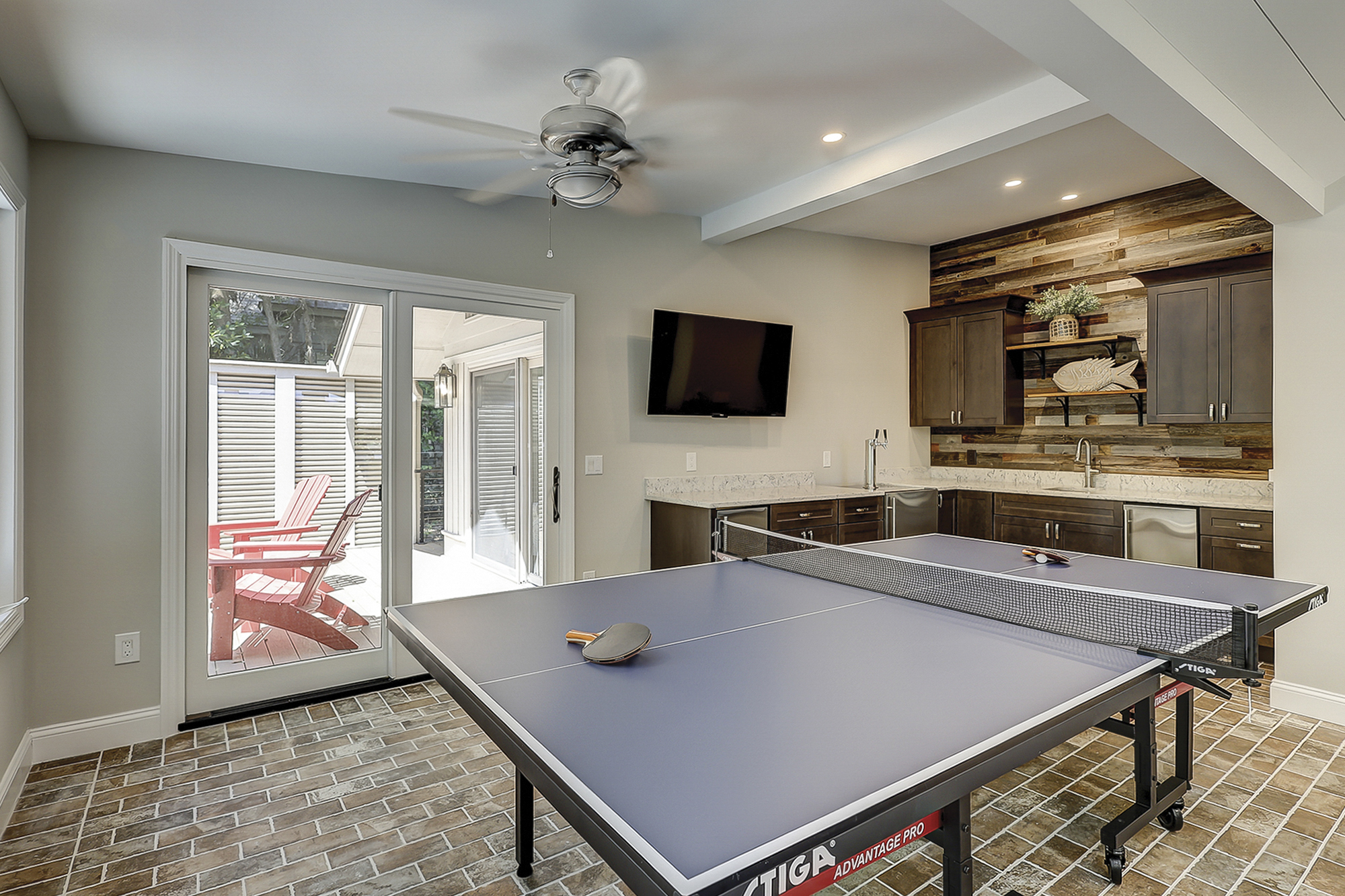 - Three Living Areas with Flat Screen Televisions. One Living Area Includes: Ice Machine, Beverage Fridge + Sink & Ping Pong Table.
