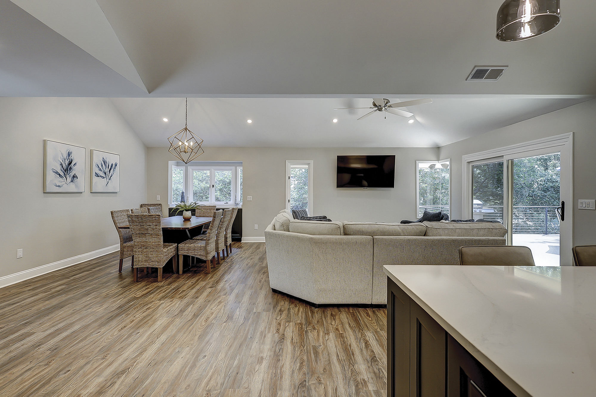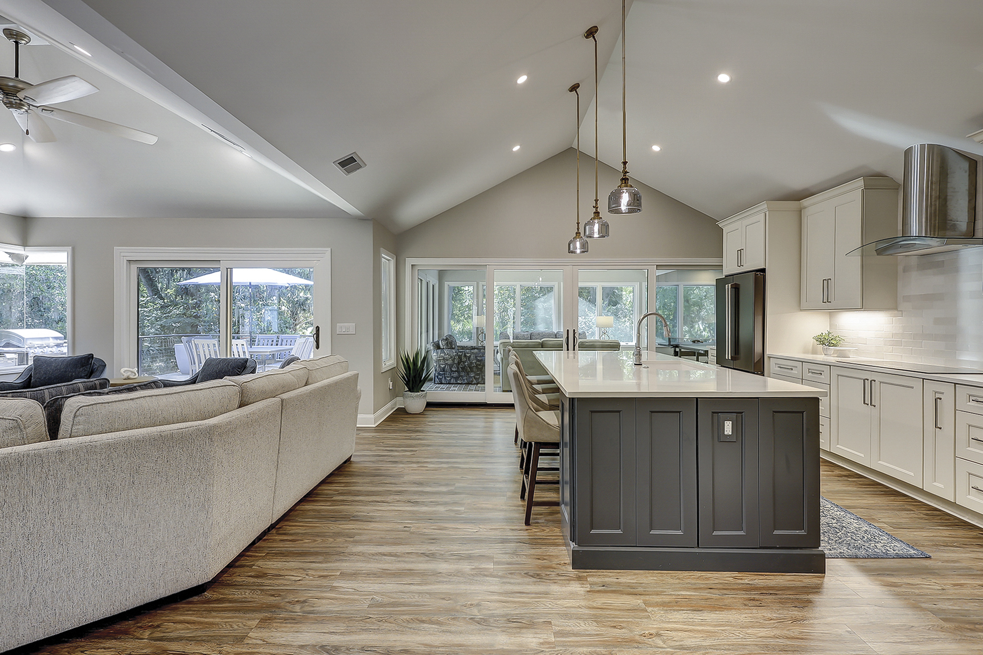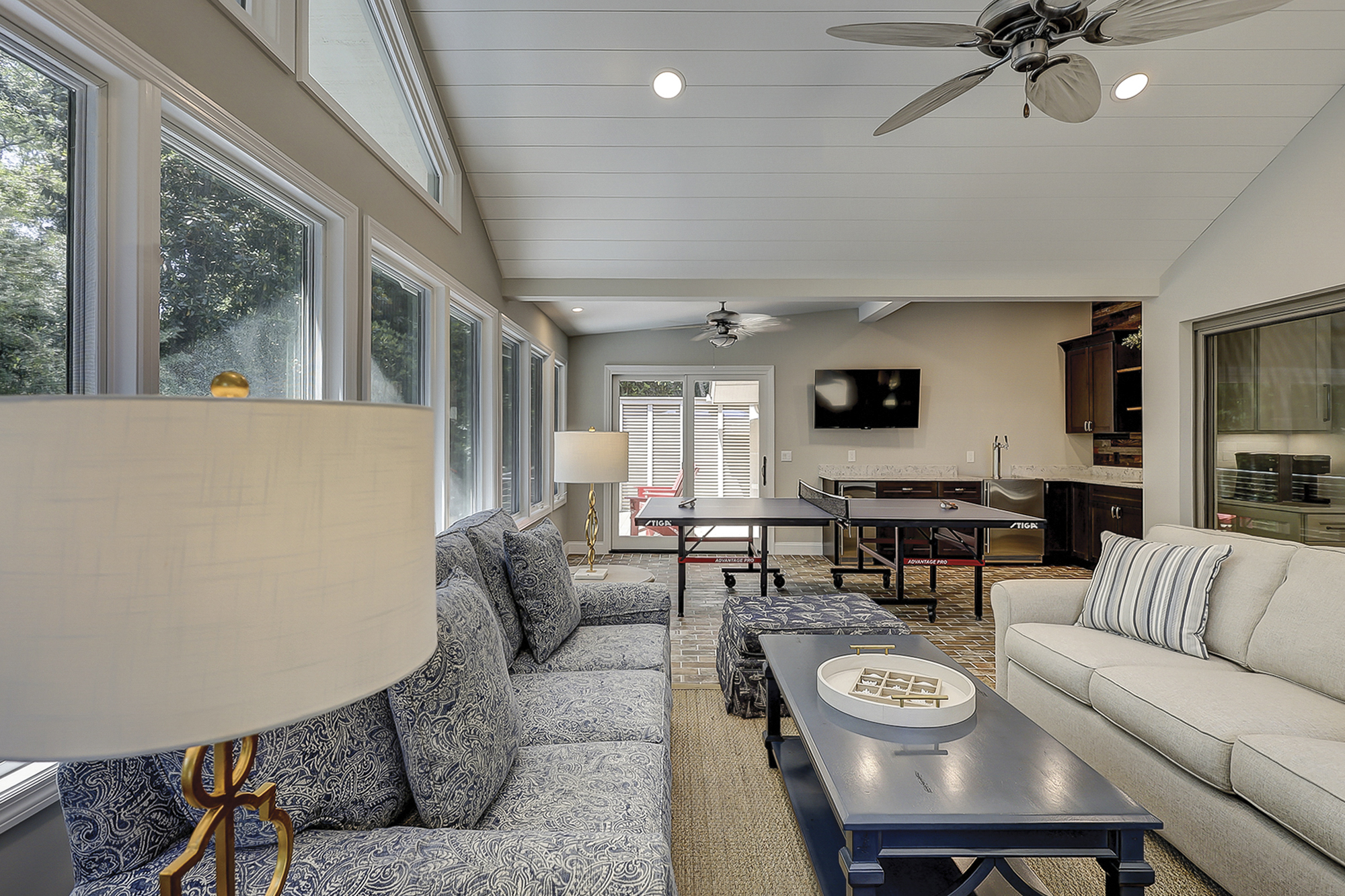- Three Living Areas with Flat Screen Televisions. One Living Area Includes: Ice Machine, Beverage Fridge + Sink & Ping Pong Table.