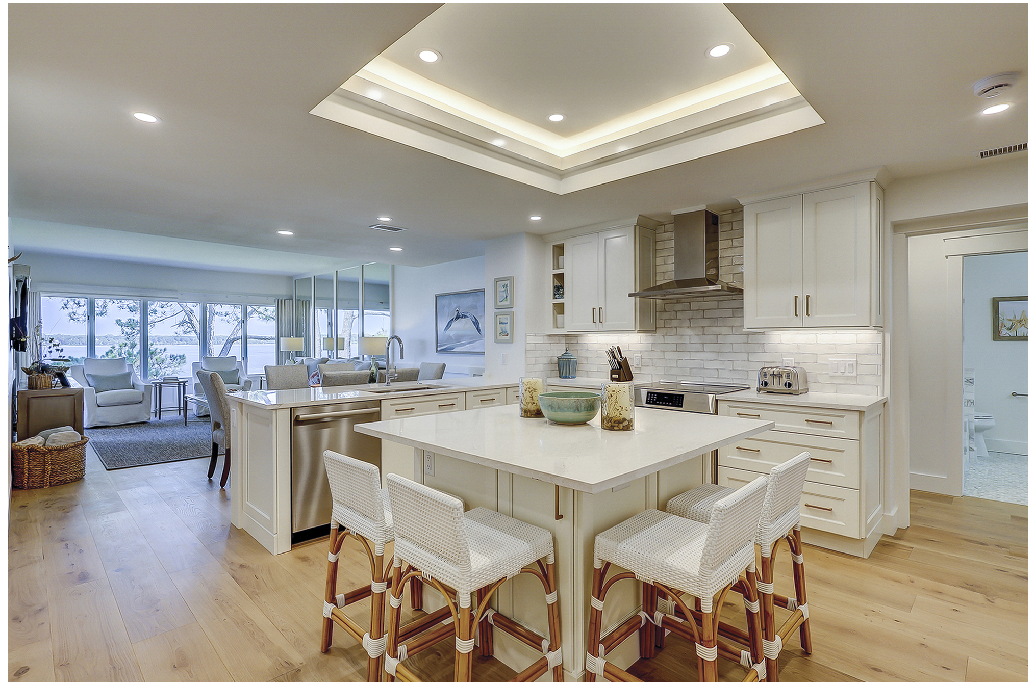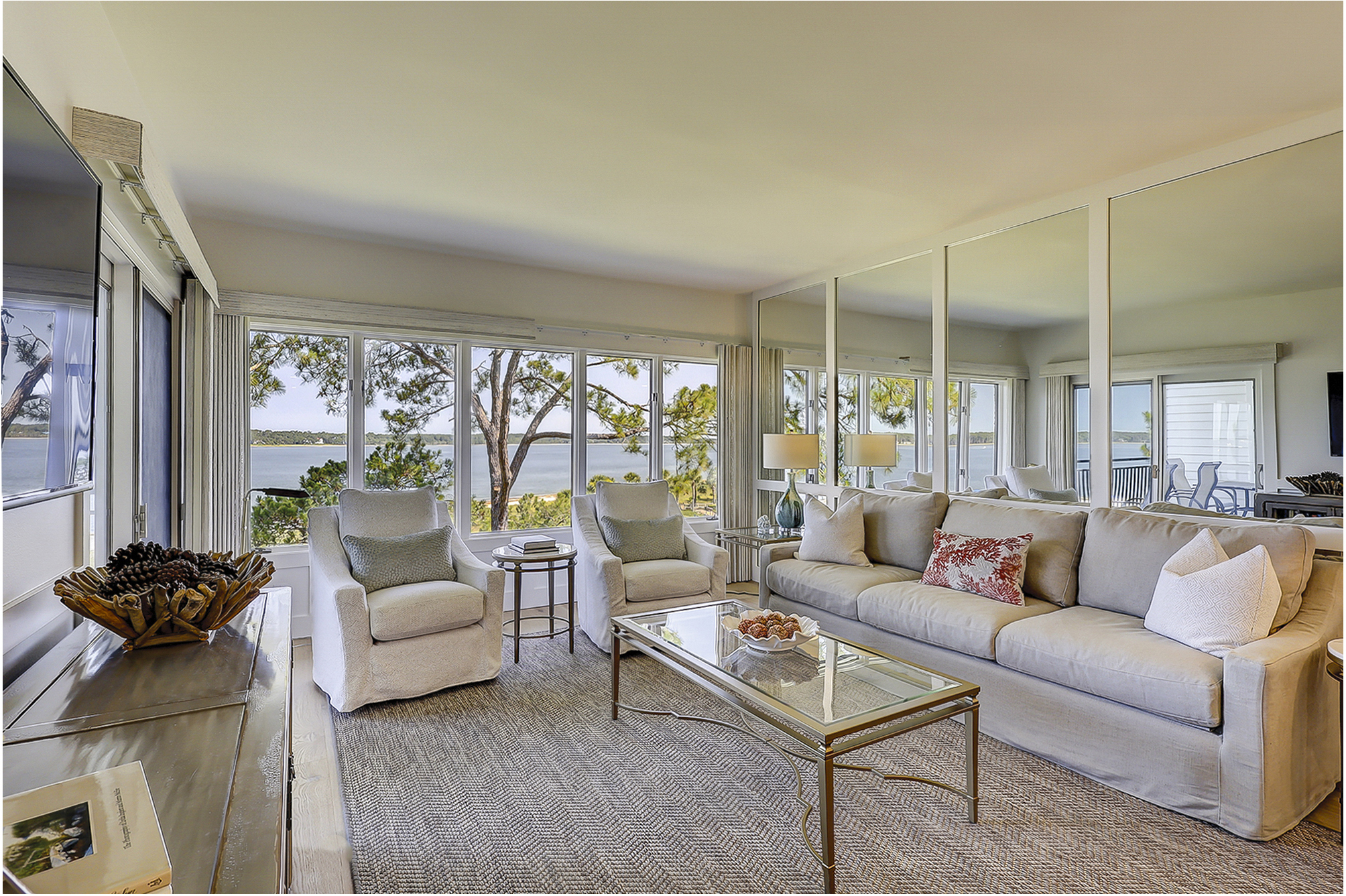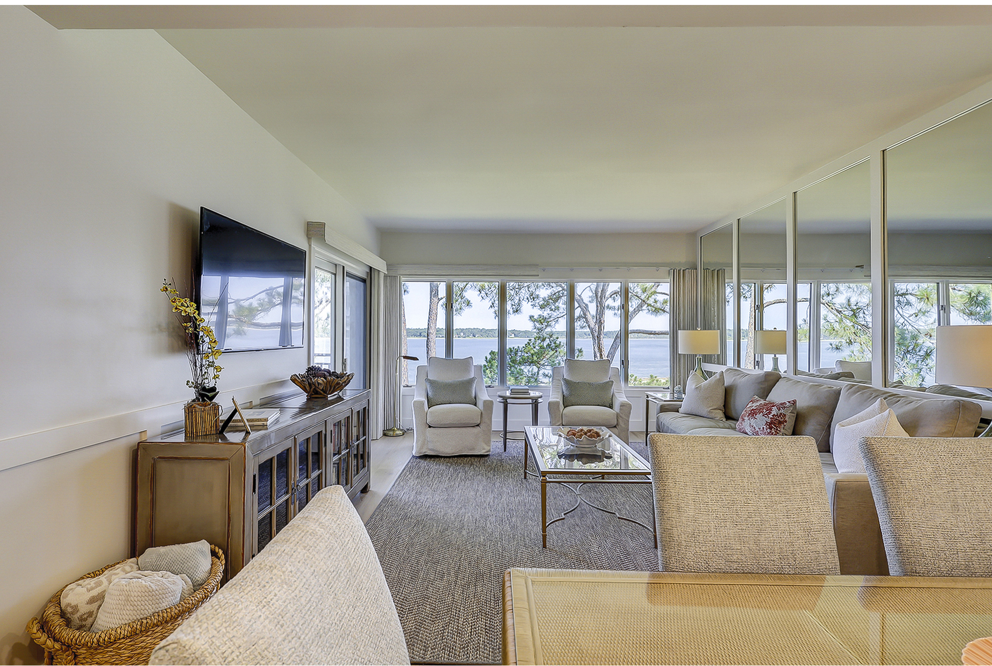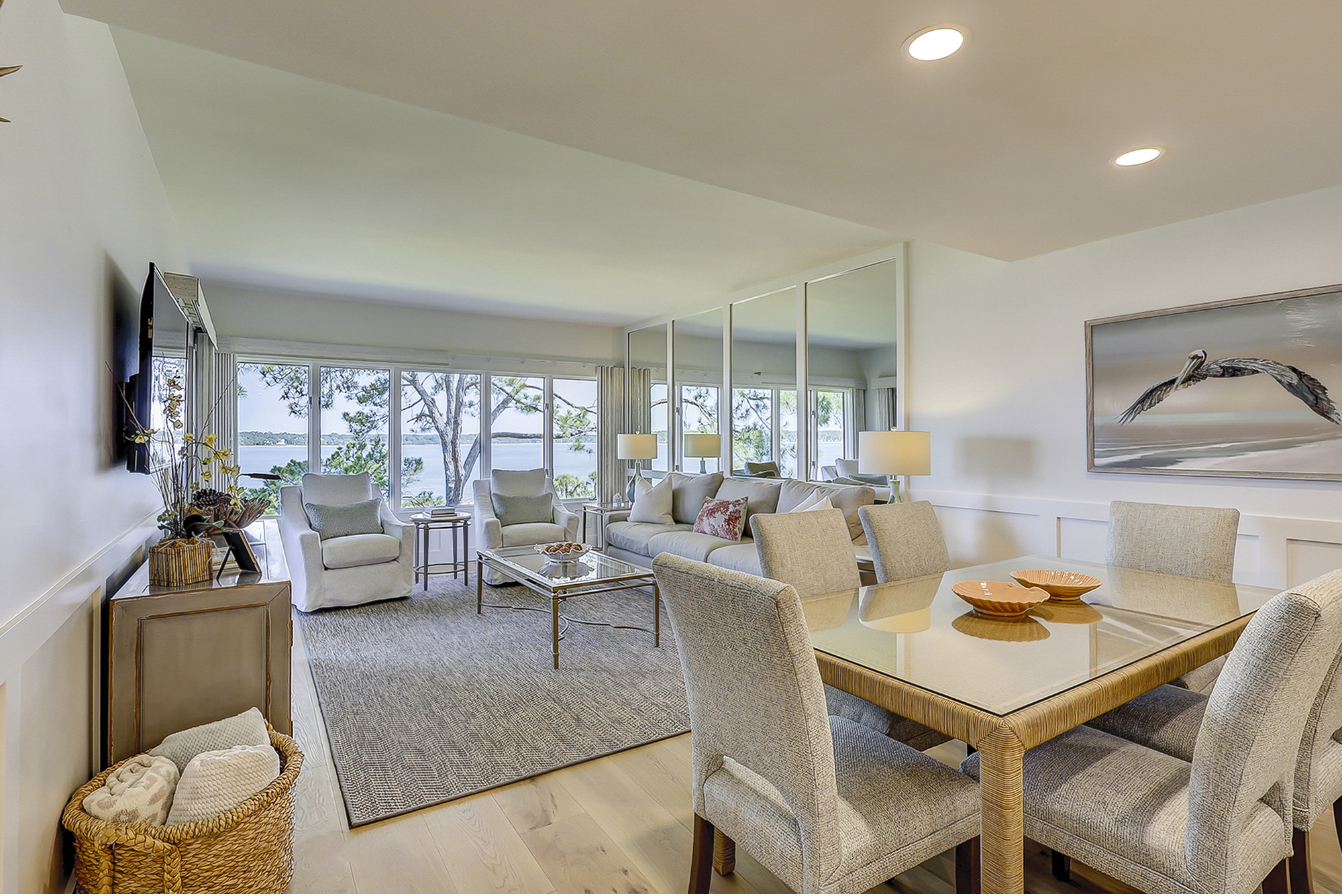 The living room offers expansive views of the water. There is a large flat screen television in the living room as well. It is open to the dining area and fully equipped kitchen.
