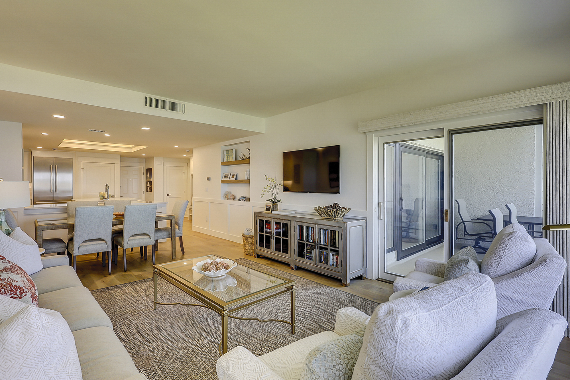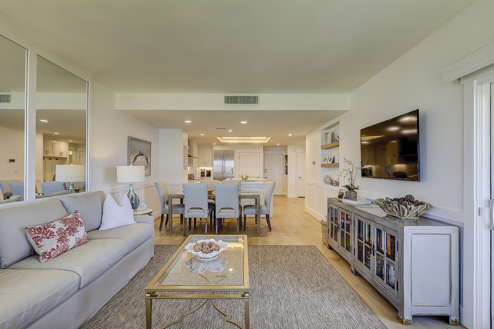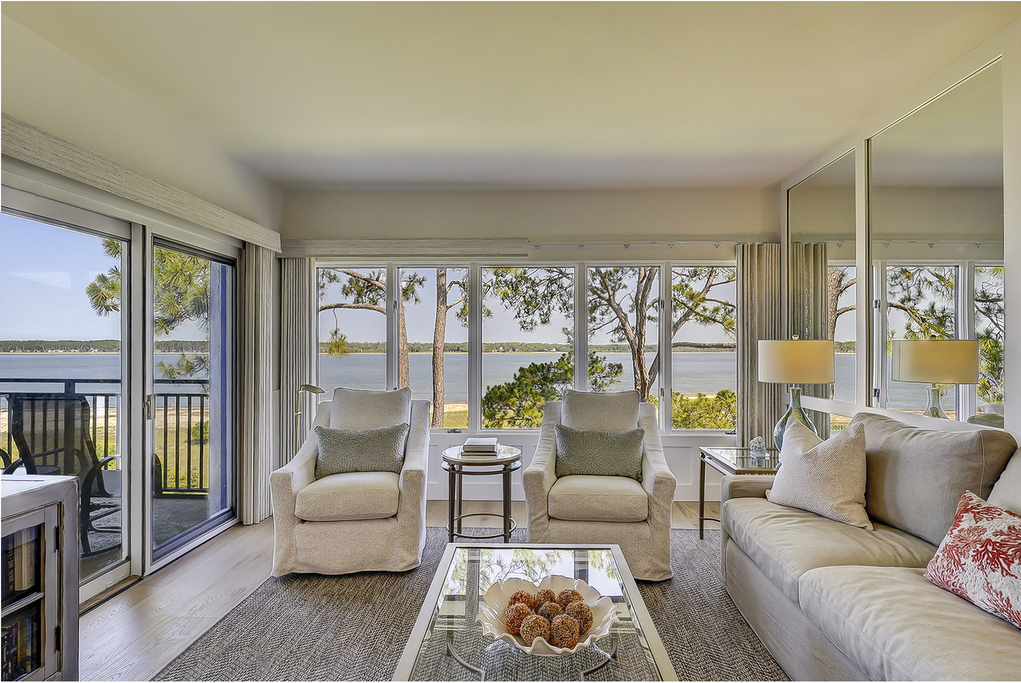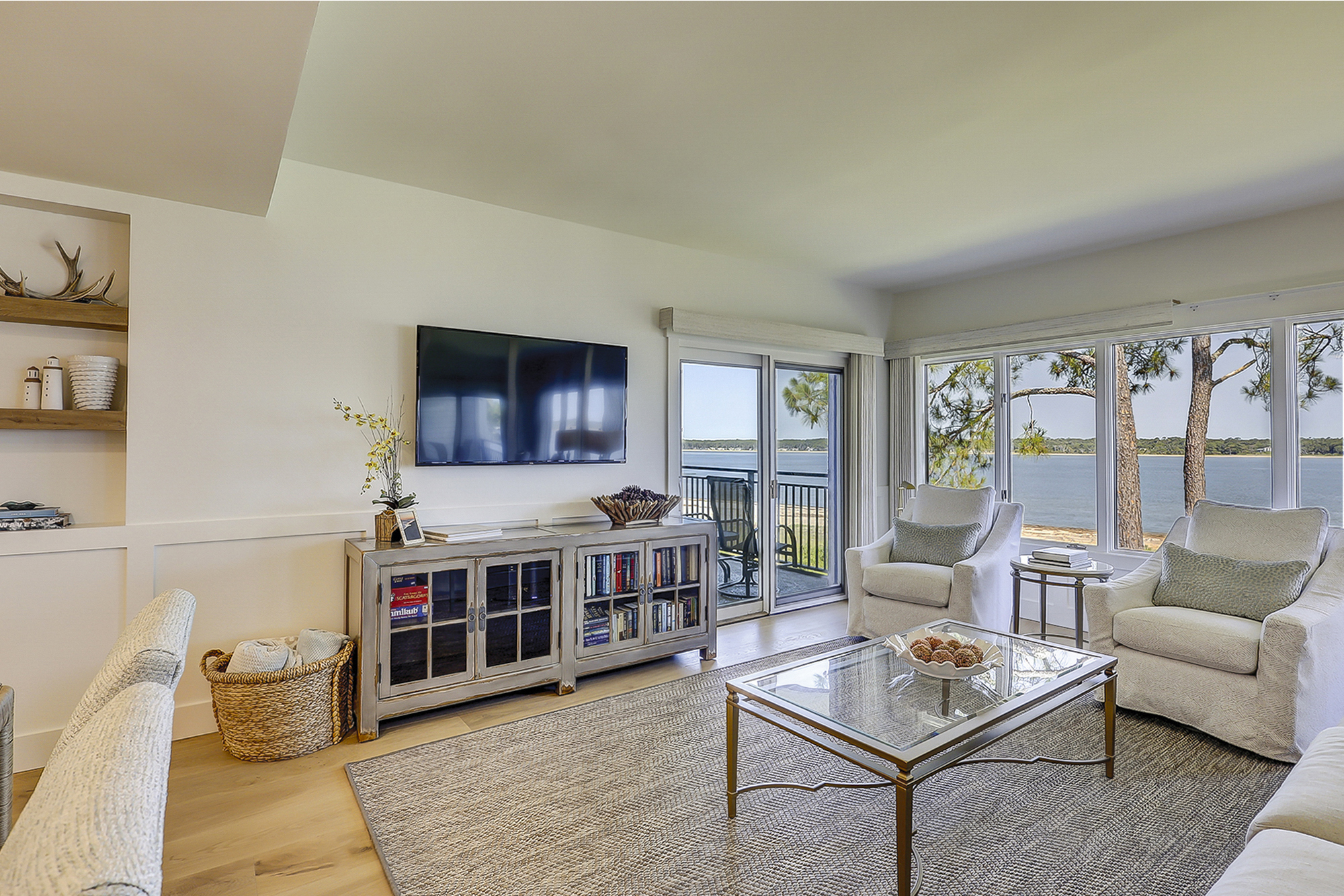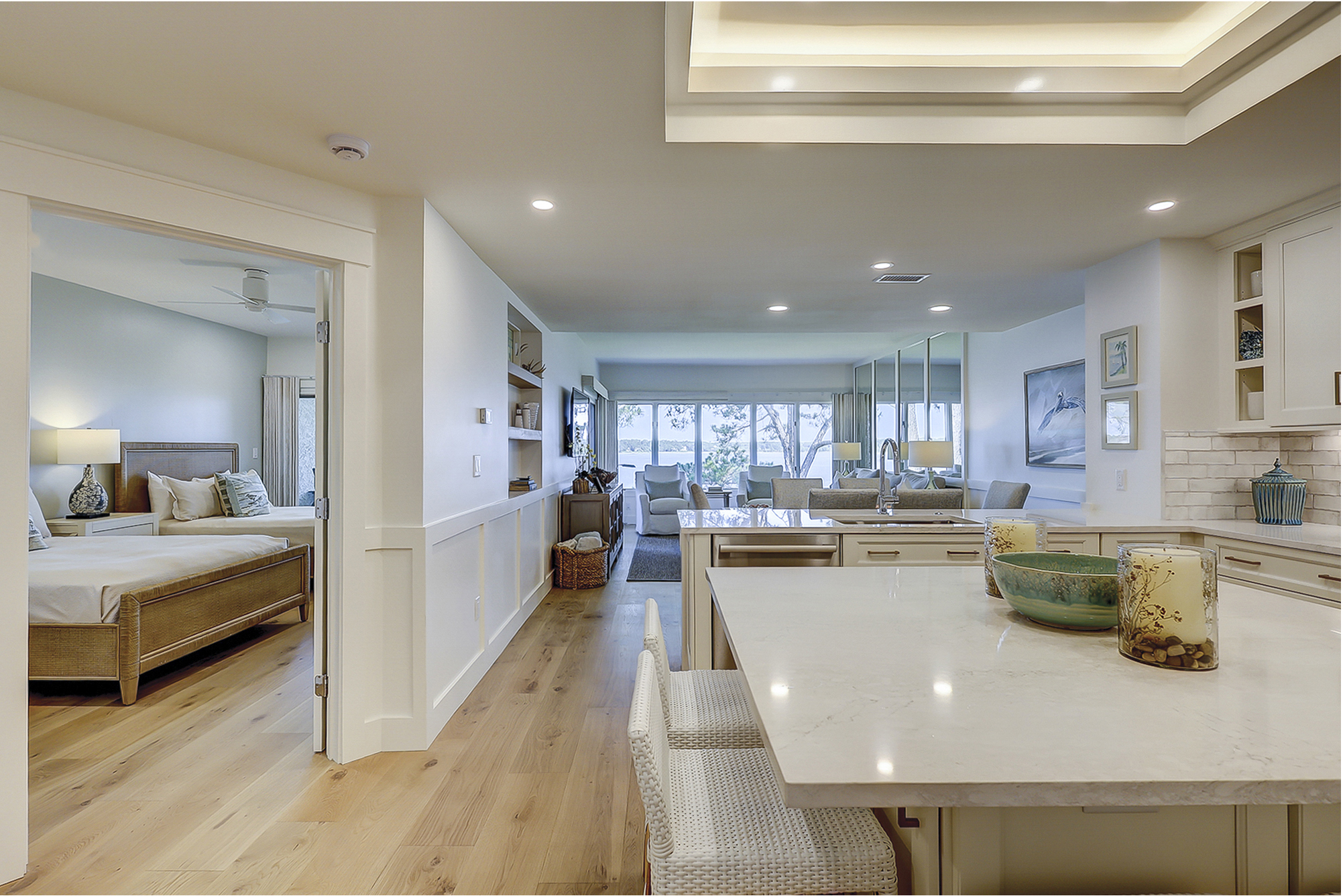 The living room offers expansive views of the water. There is a large flat screen television in the living room as well. It is open to the dining area and fully equipped kitchen.