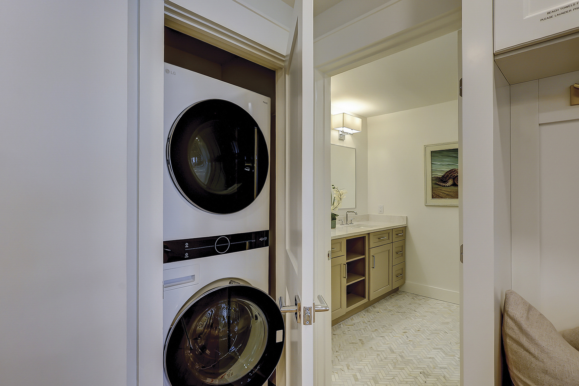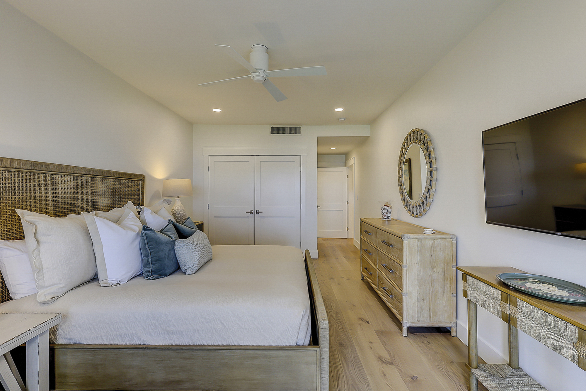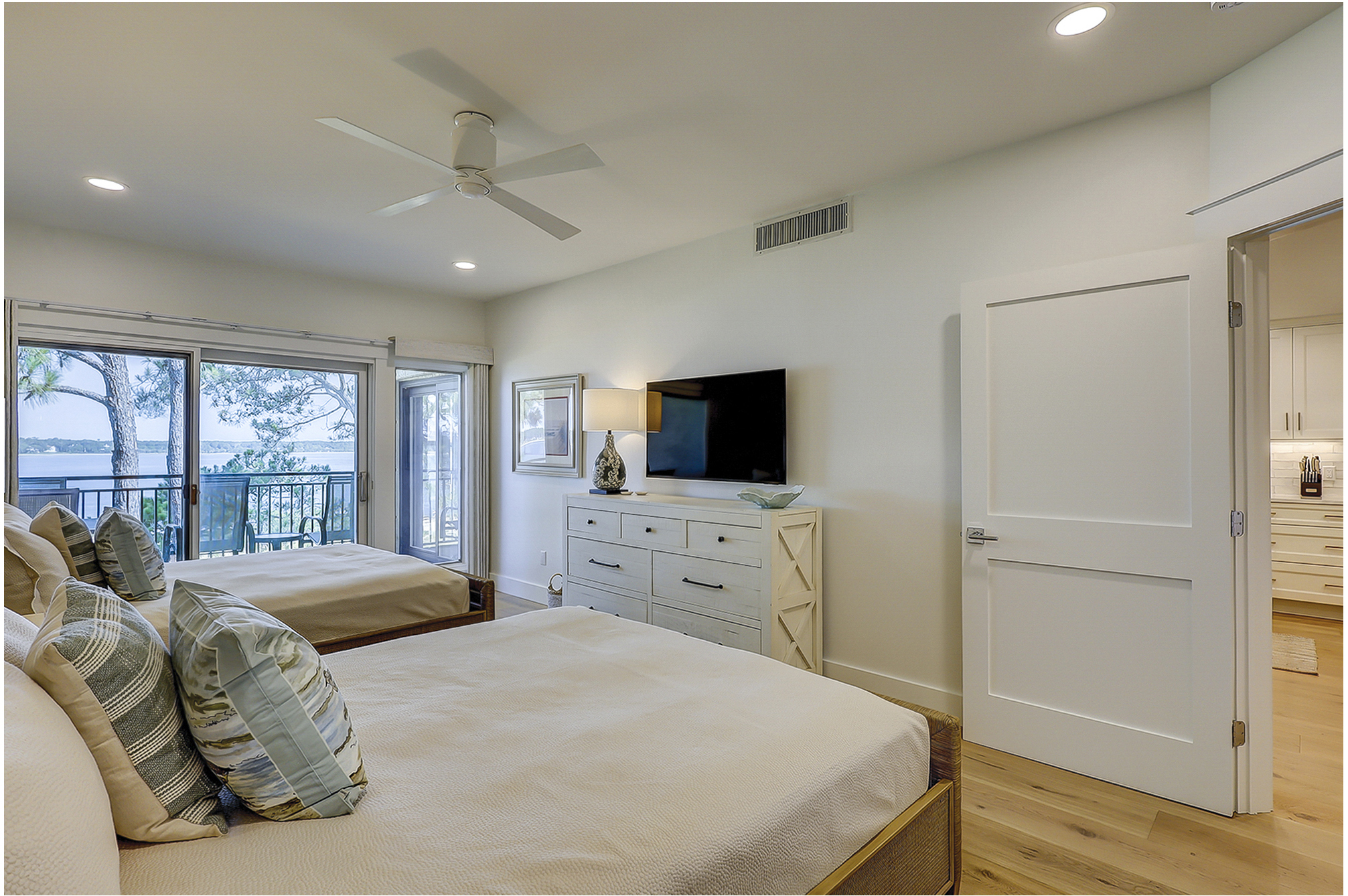 The master bedroom has a king bed and a flat screen television. It also features access to a private beachfront balcony. The recently renovated private master bath has a double vanity and a walk-in shower.