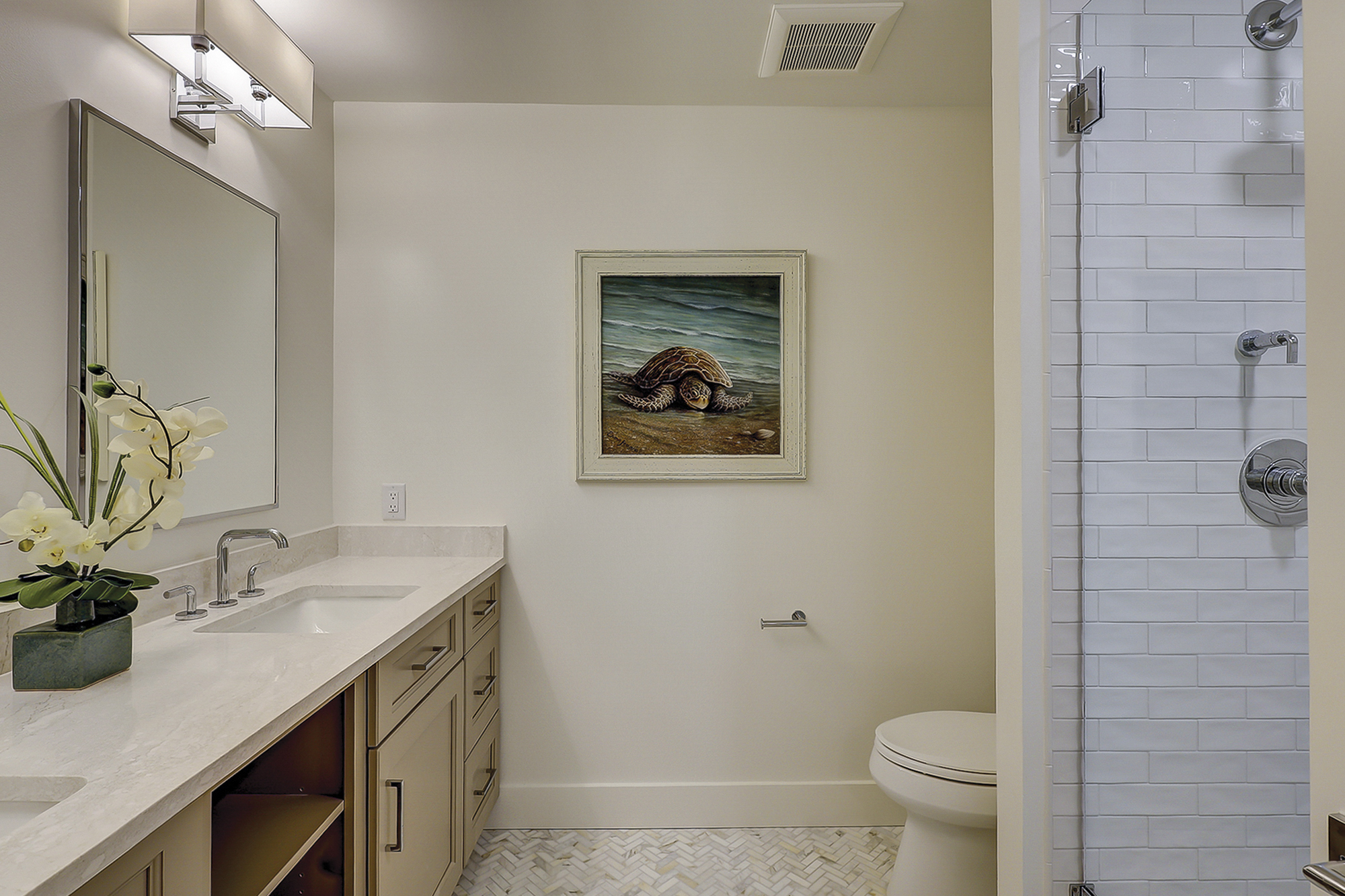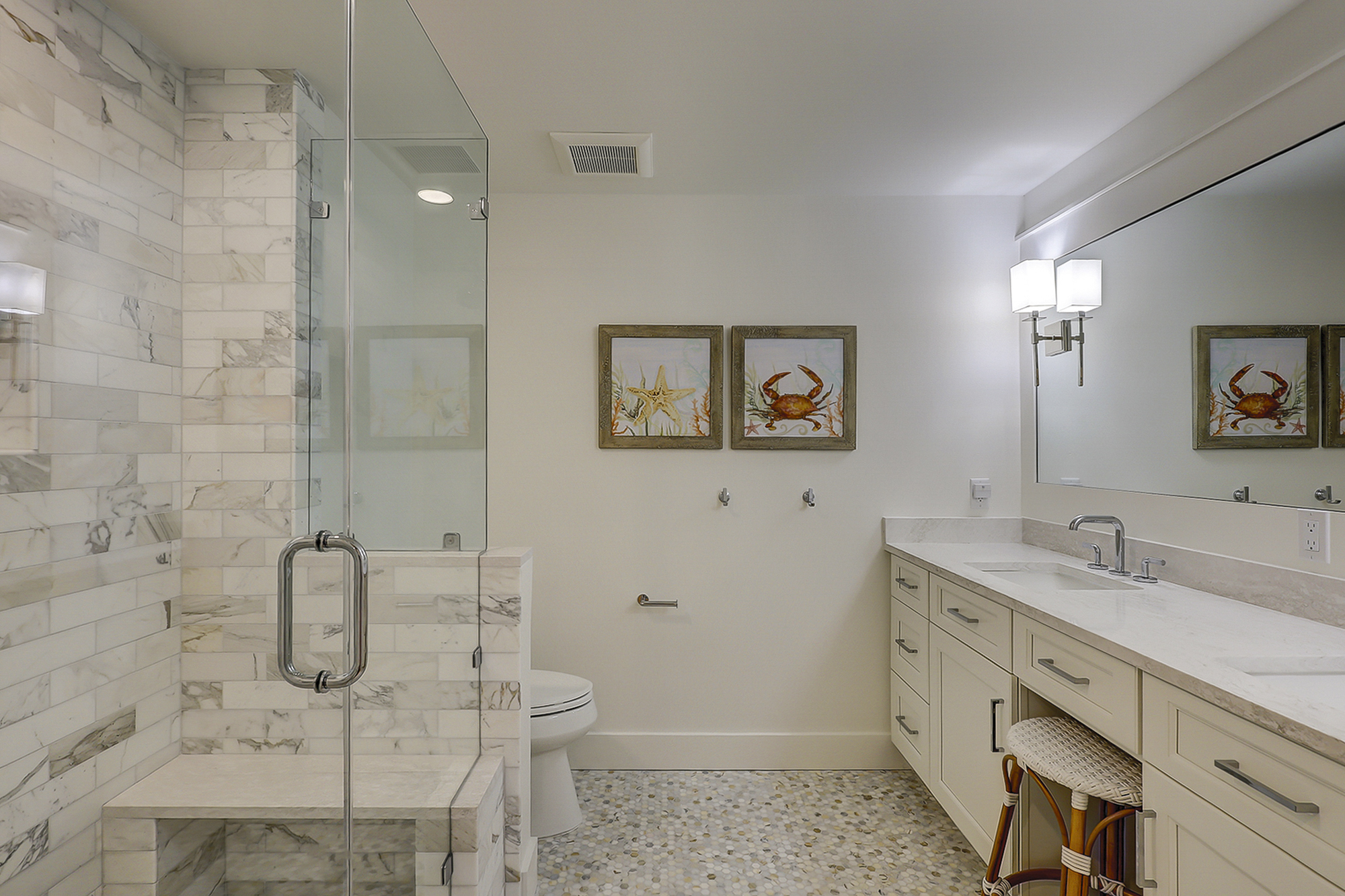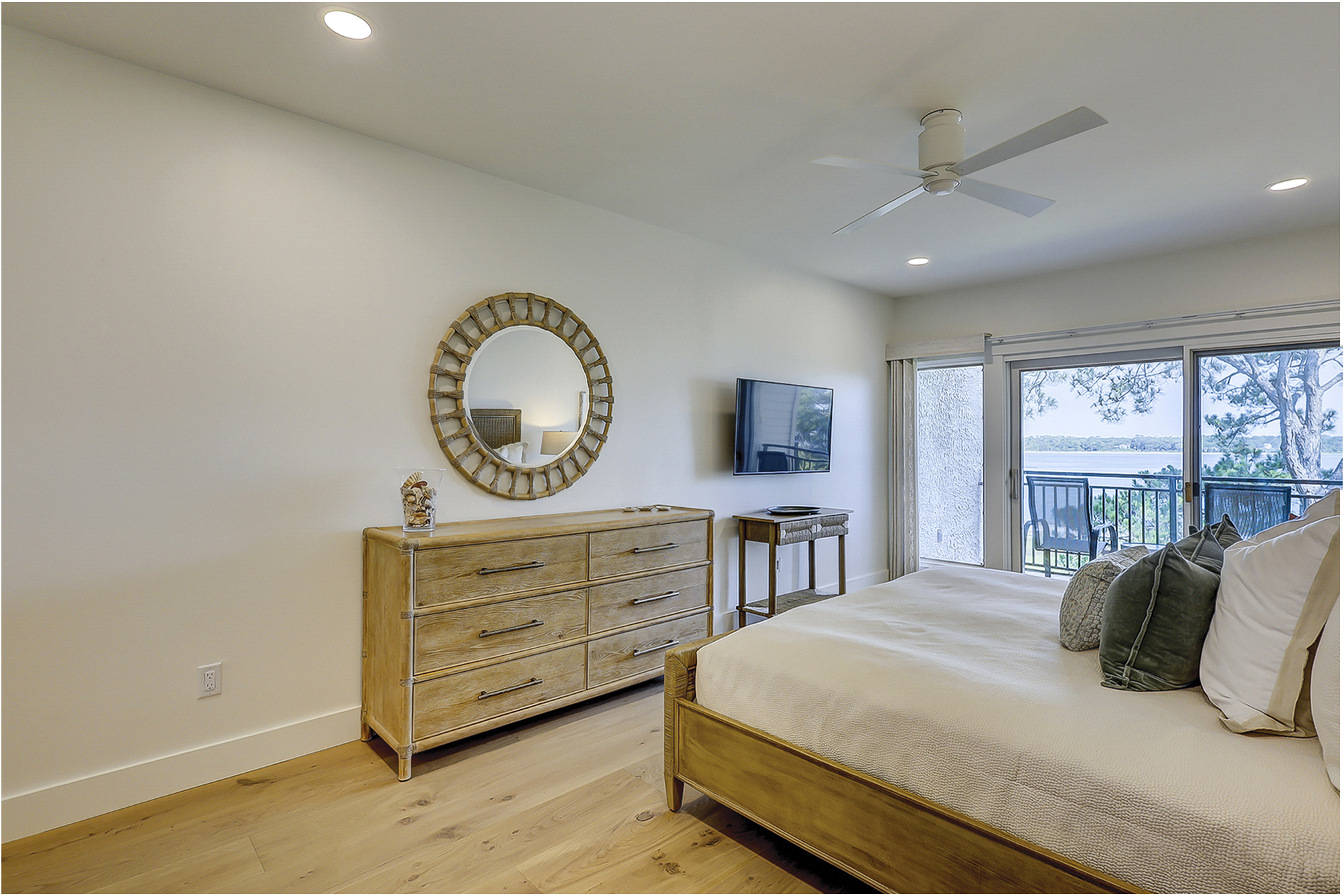 The master bedroom has a king bed and a flat screen television. It also features access to a private beachfront balcony. The recently renovated private master bath has a double vanity and a walk-in shower.
