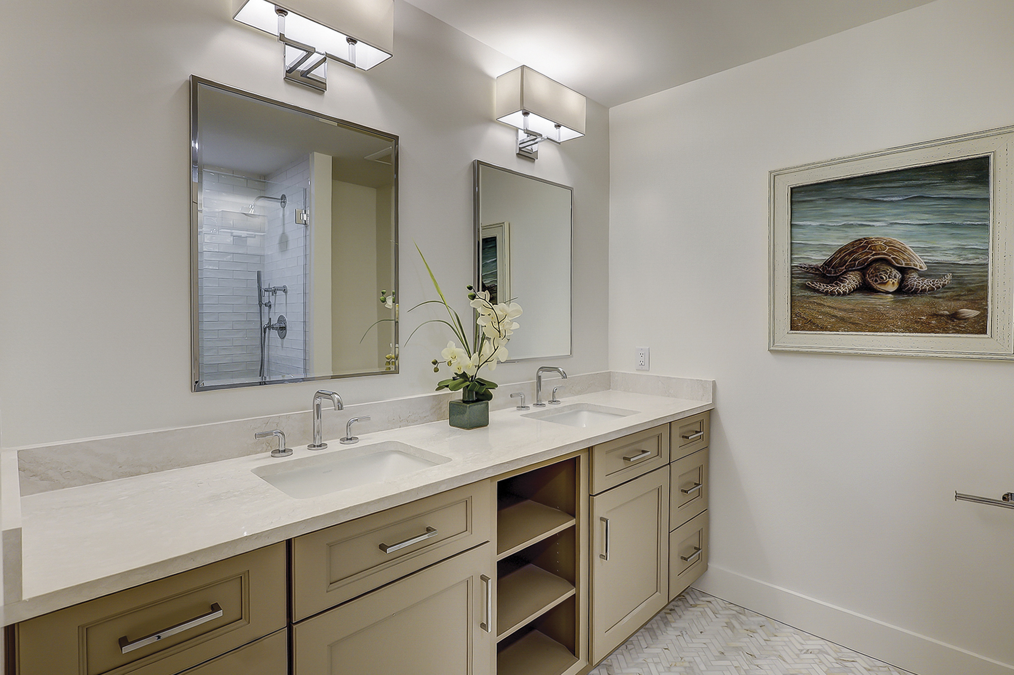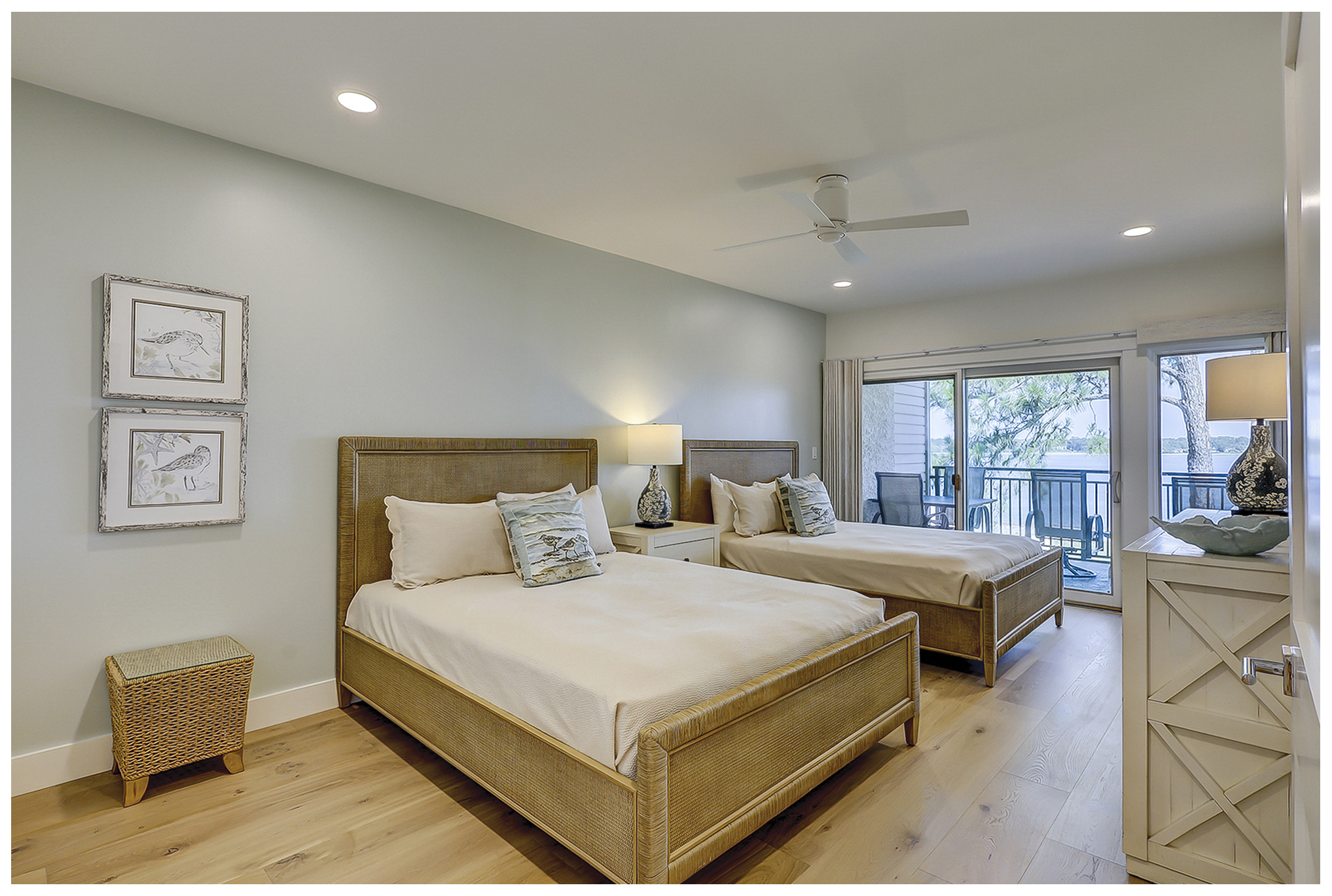 The guest bedroom has two queen beds and a flat screen television. The newly renovated bathroom has a walk-in shower and a double vanity. There is access to a balcony from this room as well.